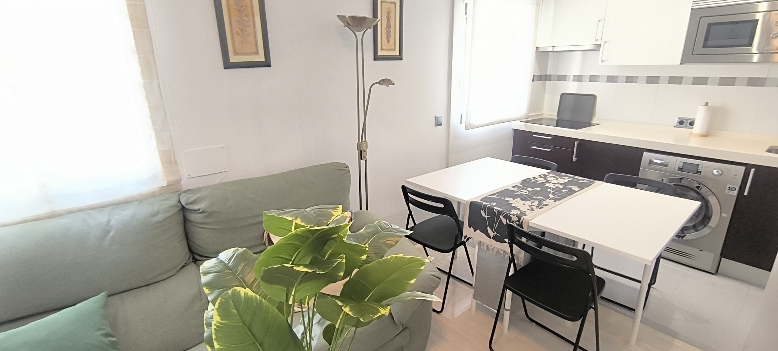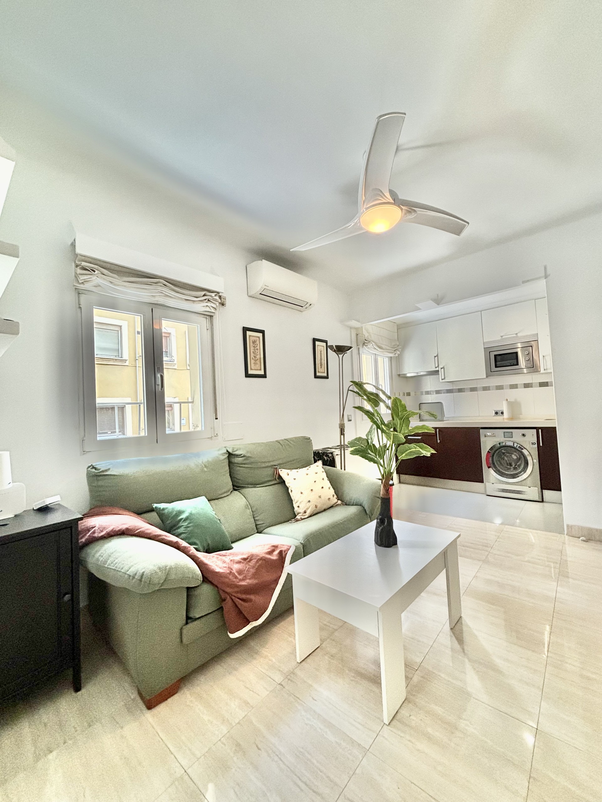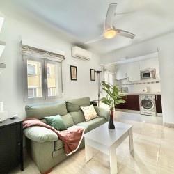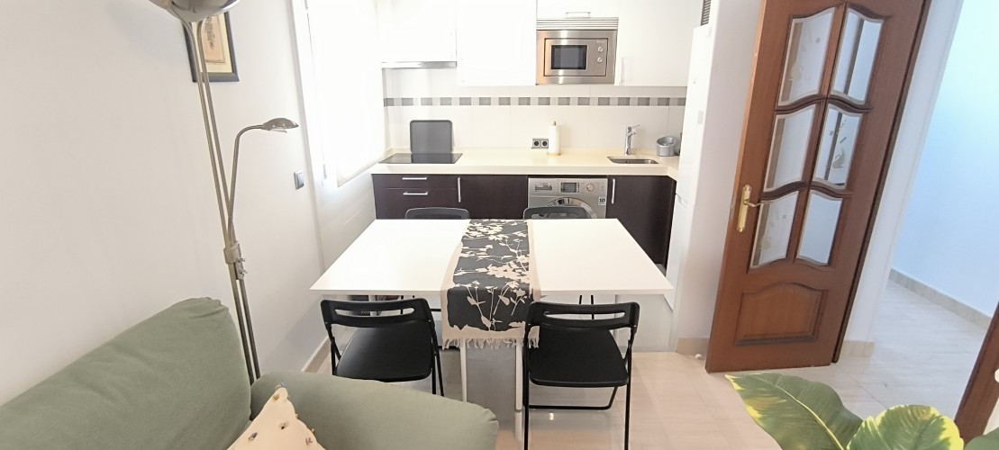 El piso consta de un recibidor que nos da paso al salón con cocina abierta haciendo un único espacio, la cocina equipada con nevera, lavadora, microondas, extractor de humo vitrocerámica, microondas, menaje de cocina y espacio para almacenar, en el salón podemos encontrarnos con sofá de dos plazas, mesa de apoyo, tv, aire acondicionado, además cuenta con ventilador en el techo el piso posee mucha luz natural.