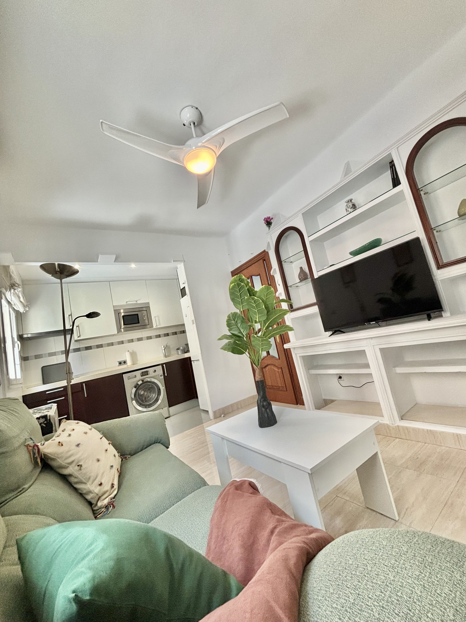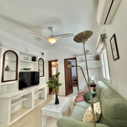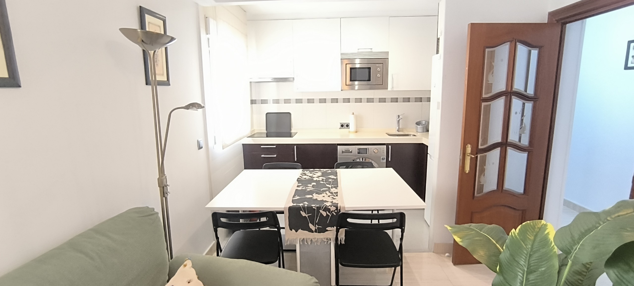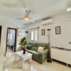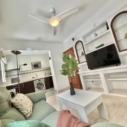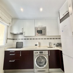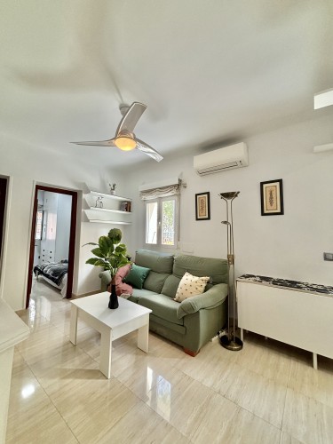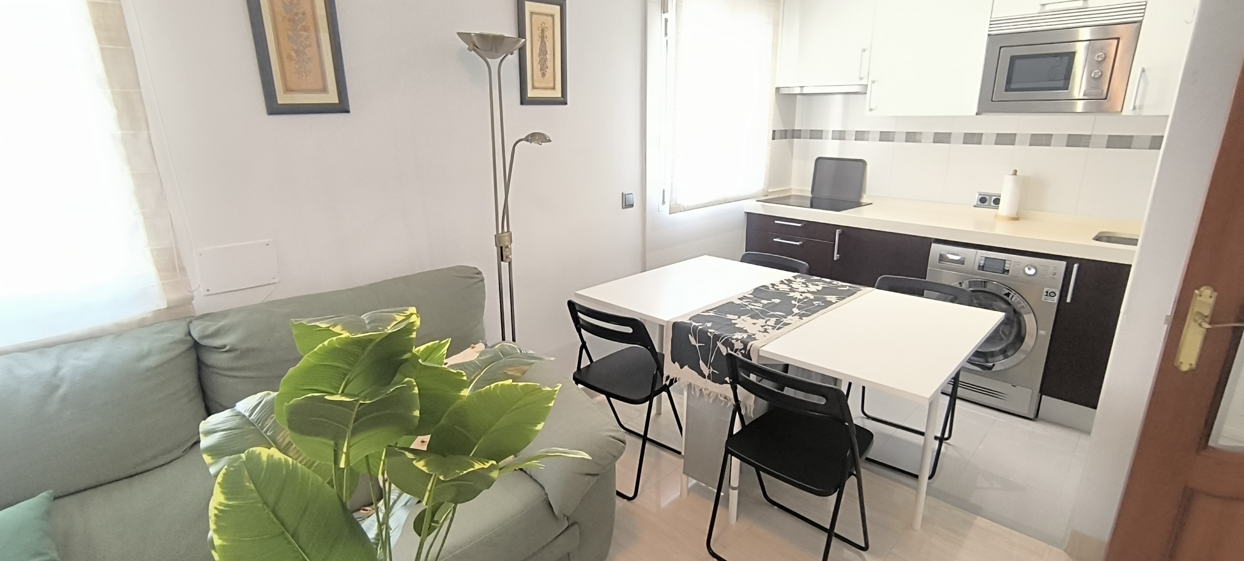 El piso consta de un recibidor que nos da paso al salón con cocina abierta haciendo un único espacio, la cocina equipada con nevera, lavadora, microondas, extractor de humo vitrocerámica, microondas, menaje de cocina y espacio para almacenar, en el salón podemos encontrarnos con sofá de dos plazas, mesa de apoyo, tv, aire acondicionado, además cuenta con ventilador en el techo el piso posee mucha luz natural.