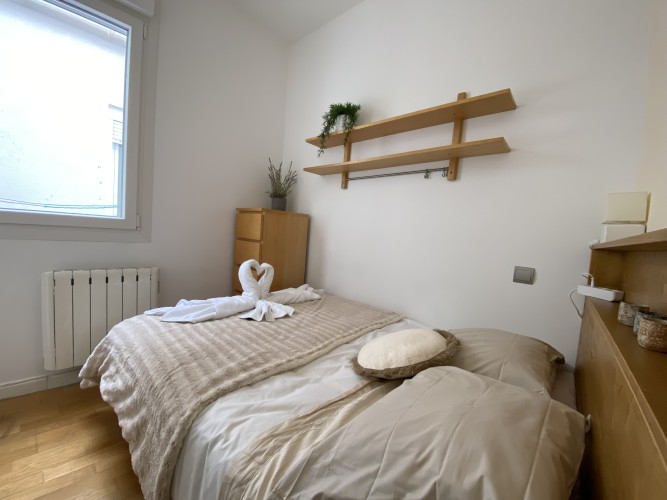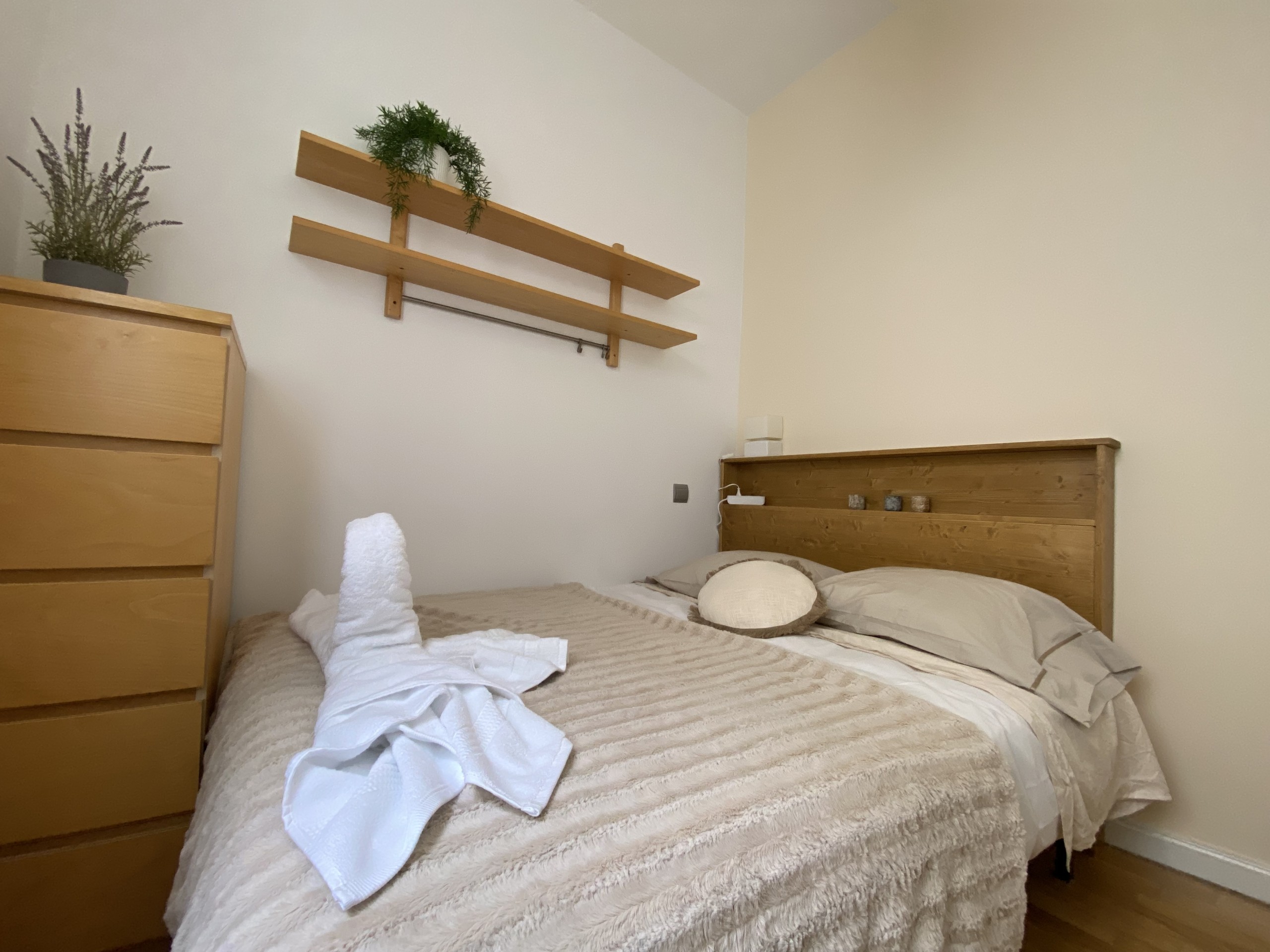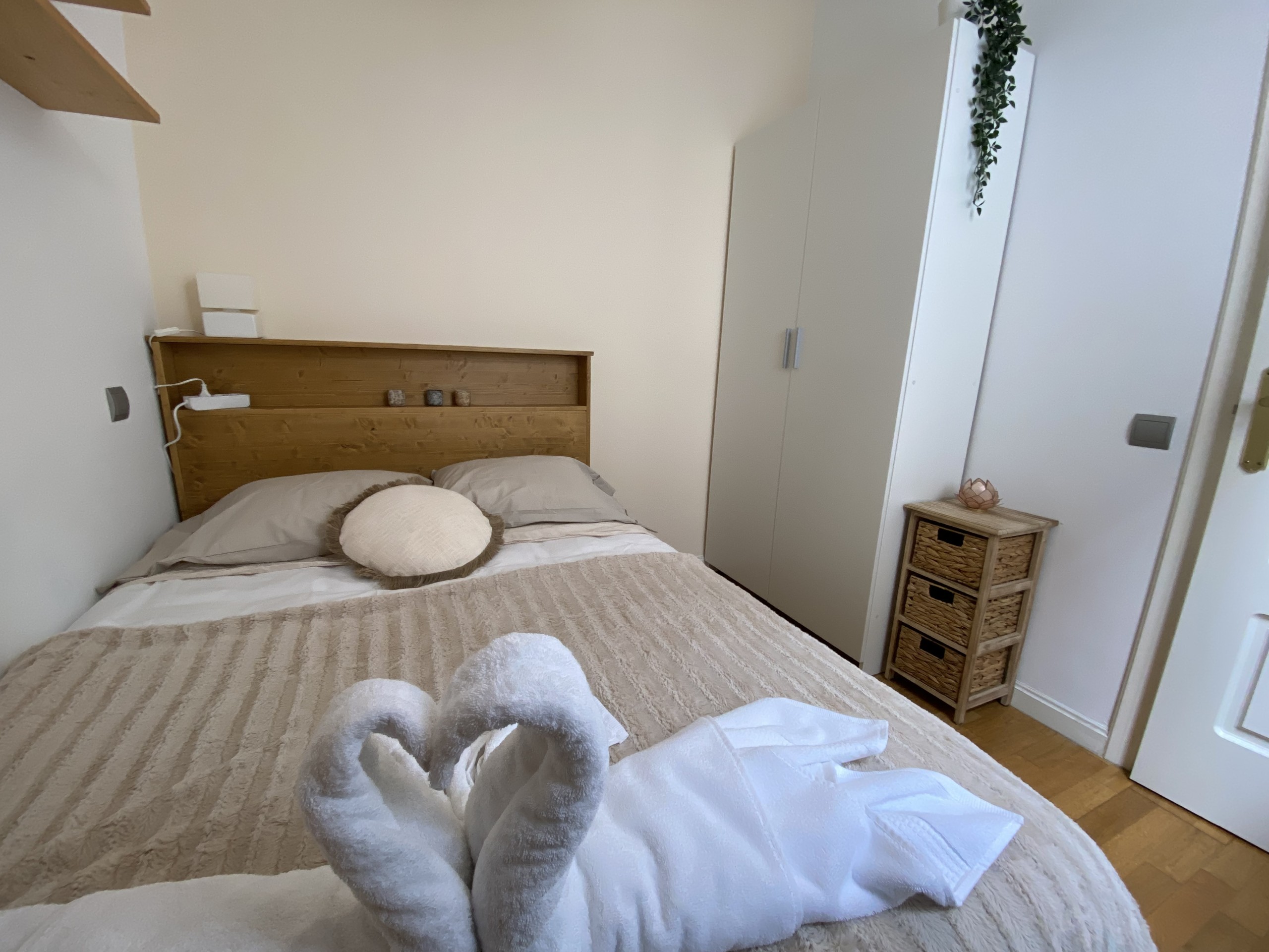 1. Habitación: Elegante y cómoda. Tiene cama doble, con cabecero, armario con puertas y