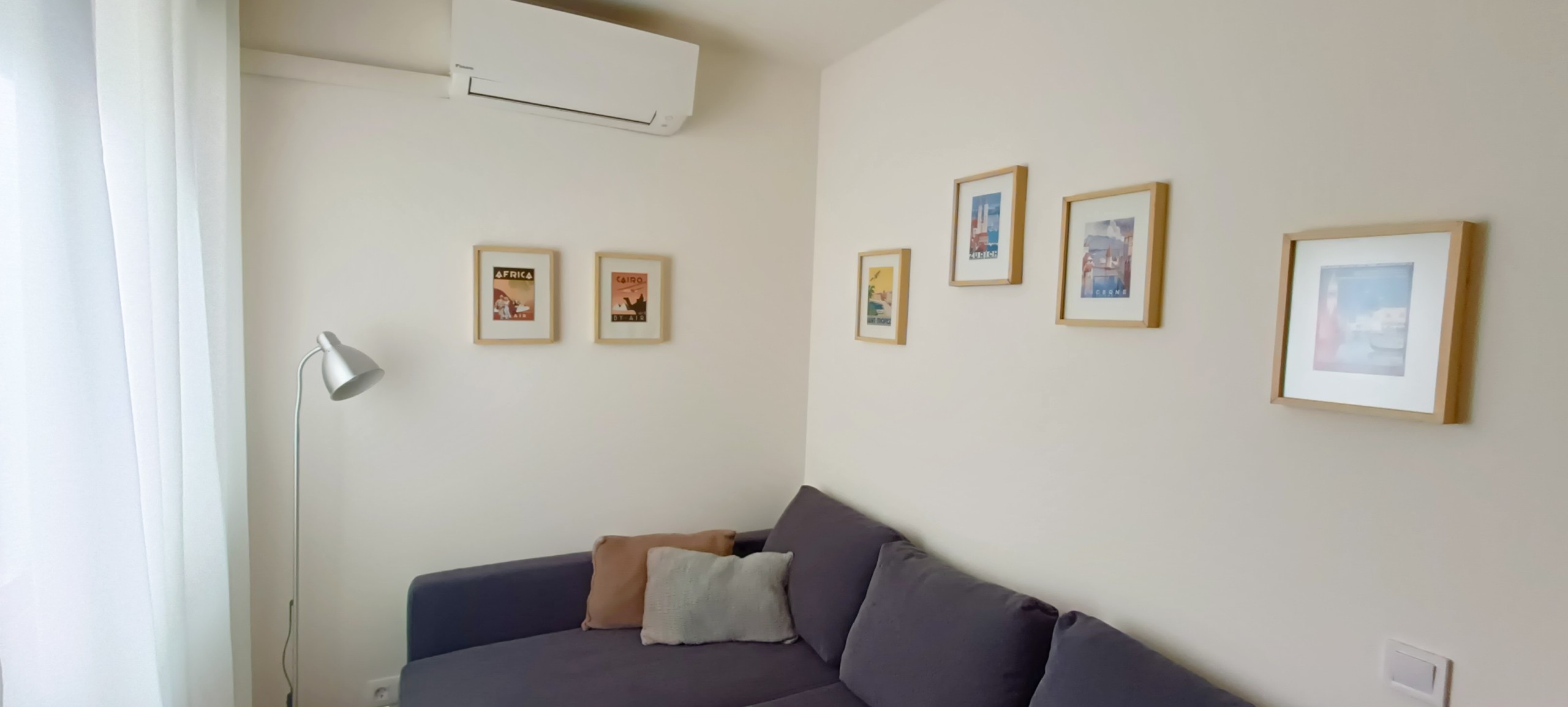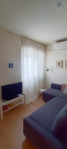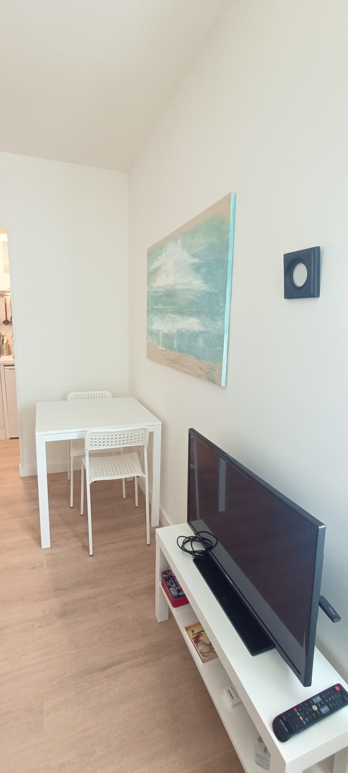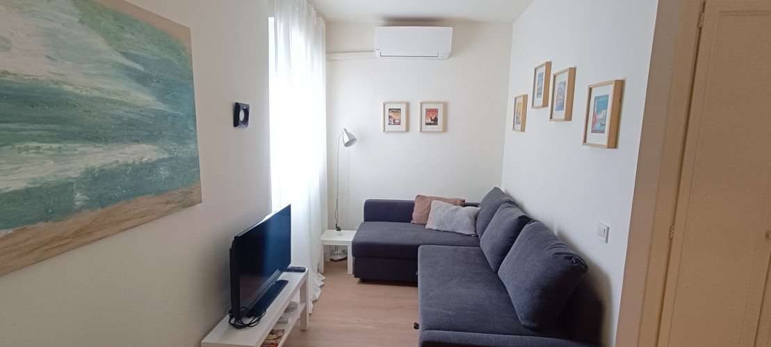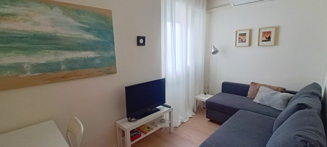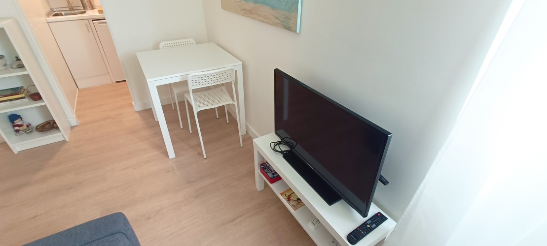 ZONA DE DESCANSO con sofá-cama chaisselongue, mueble, TV, AIRE ACONDICIONADO, armarios empotrados y mesa de comedor.