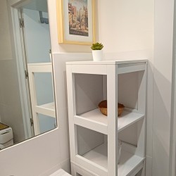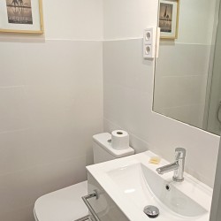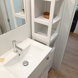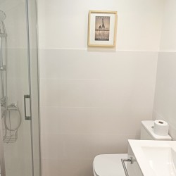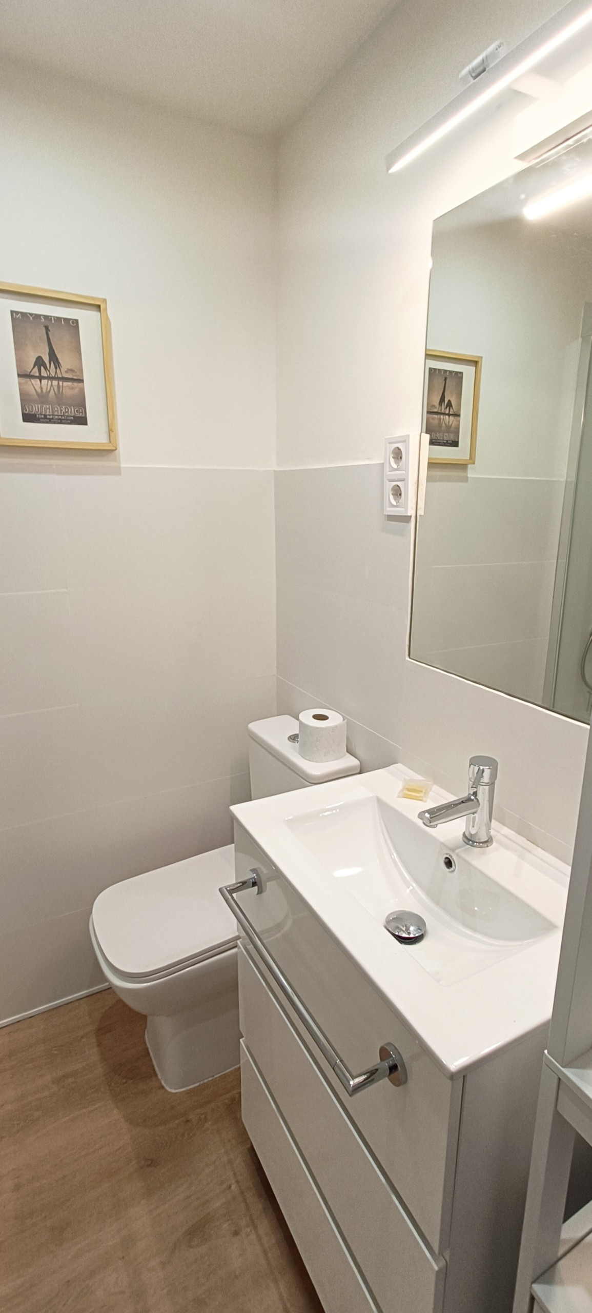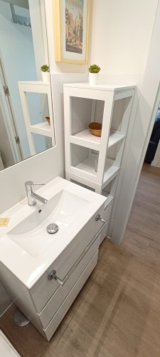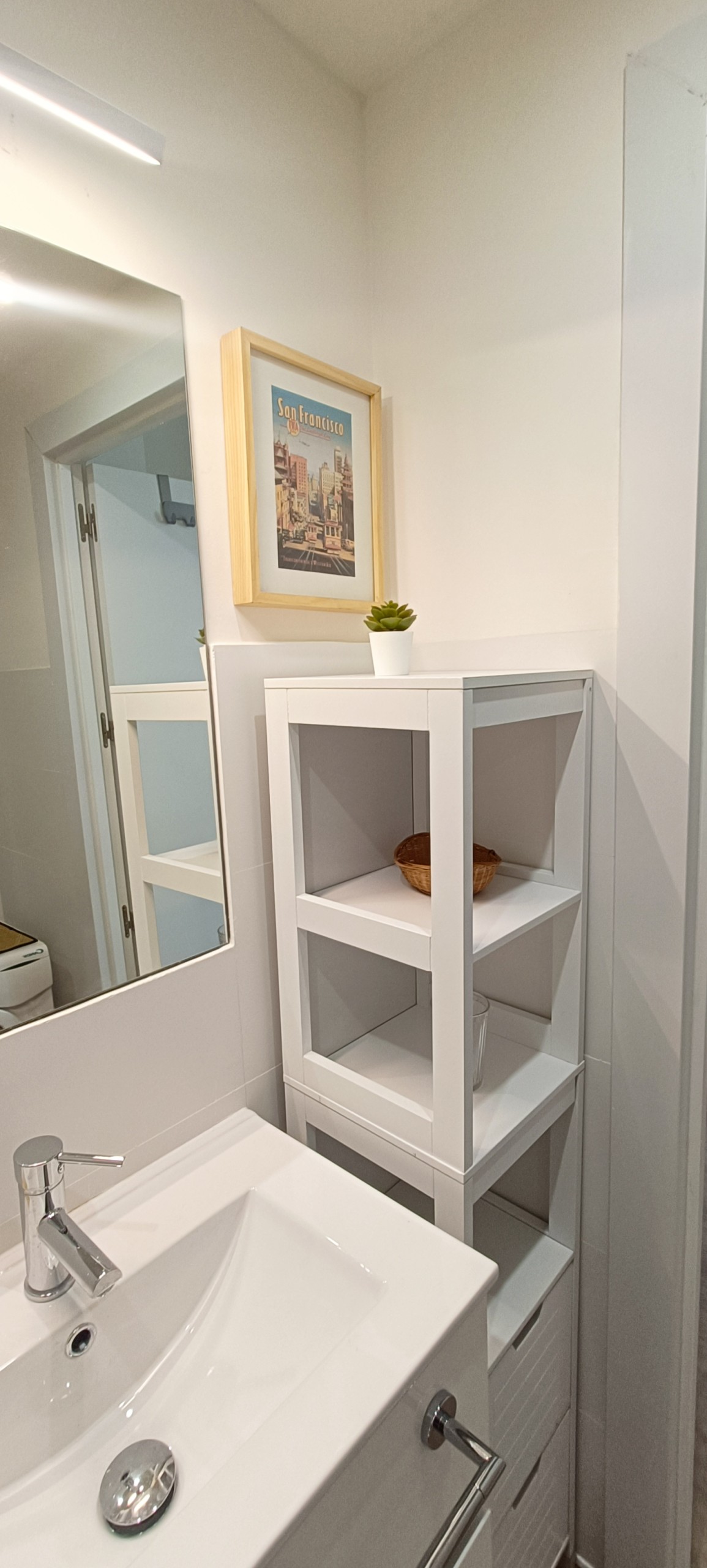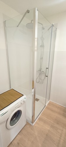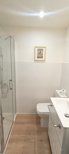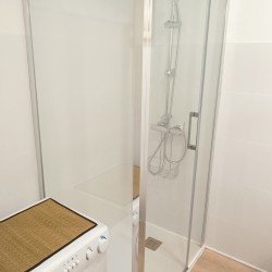 CUARTO DE BAÑO de estética impecable, con palto de ducha y mampara, mueble con cajones, y lavadora