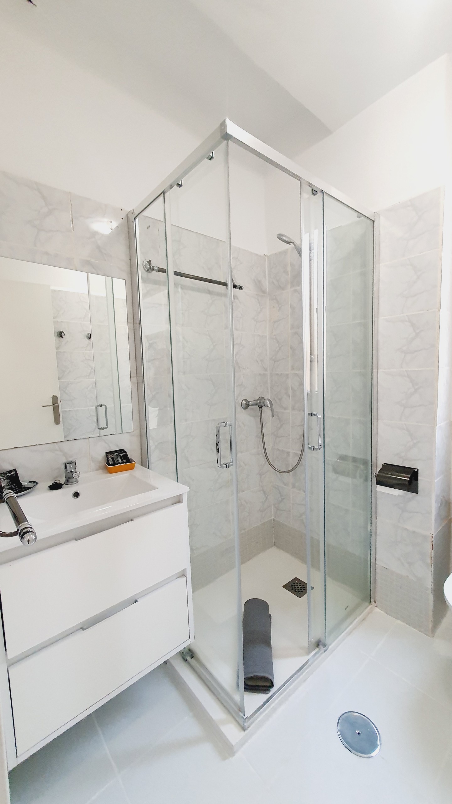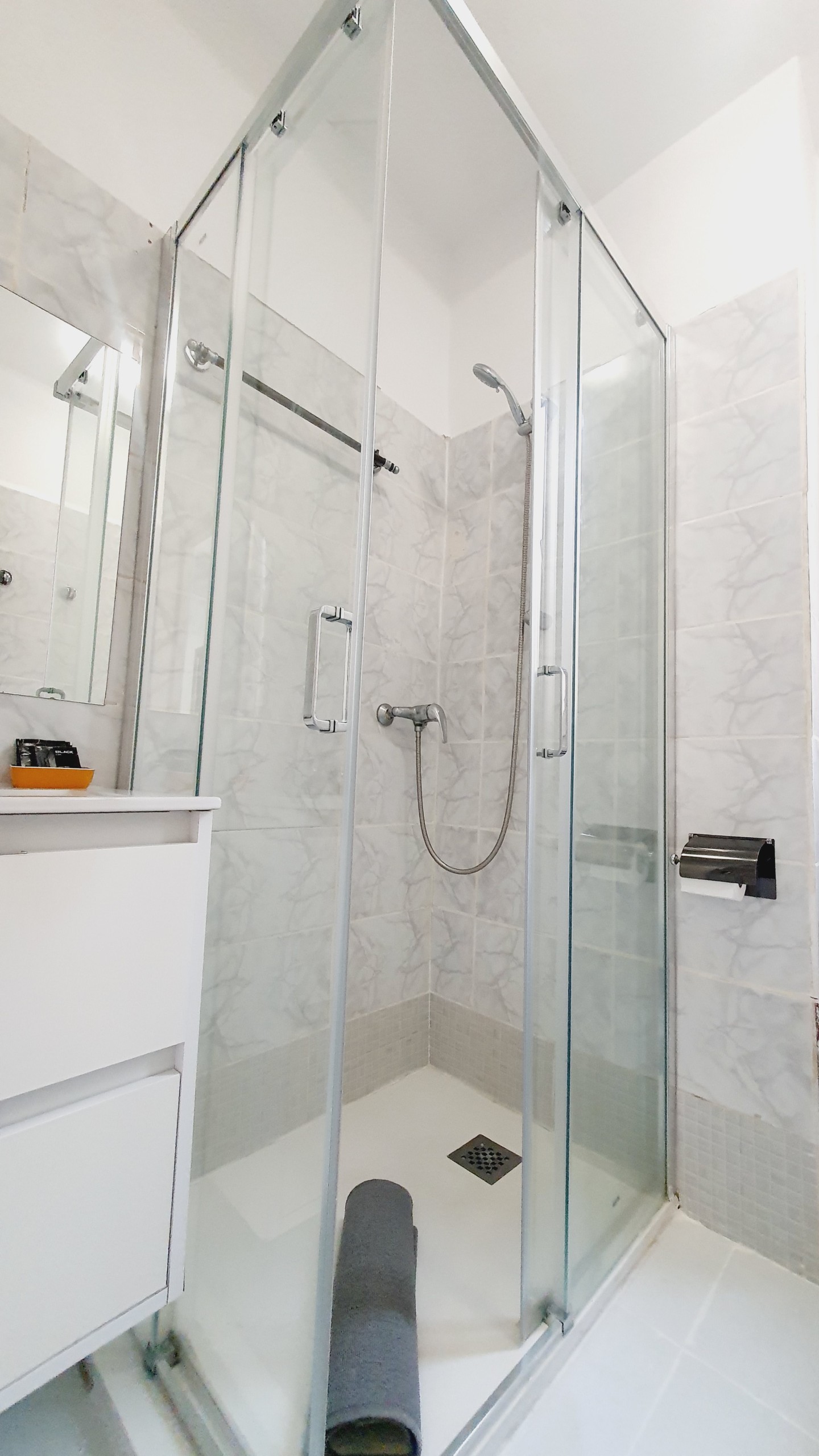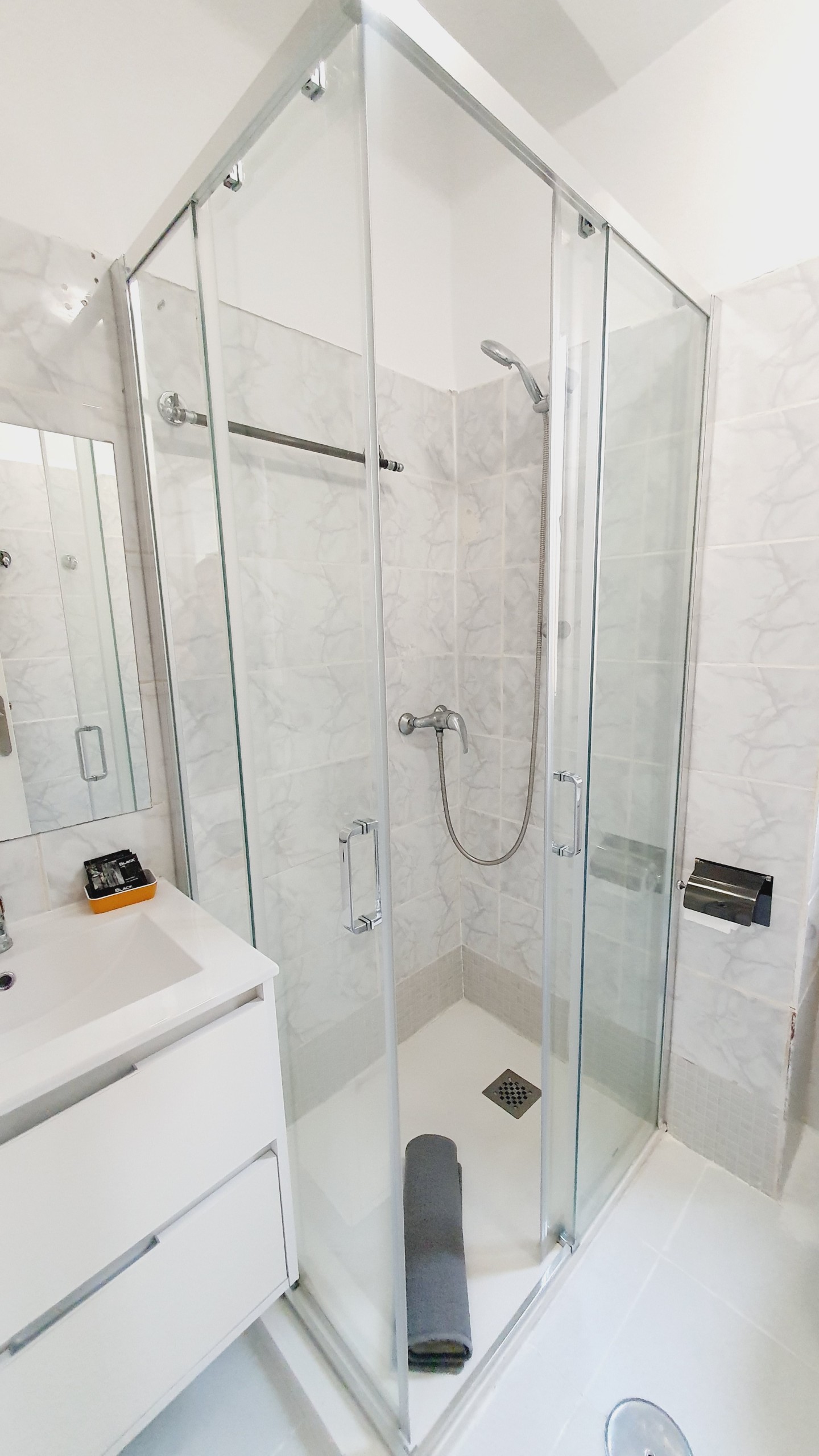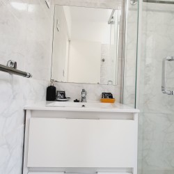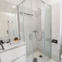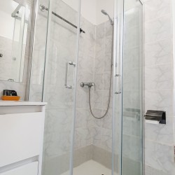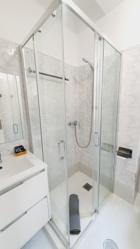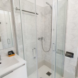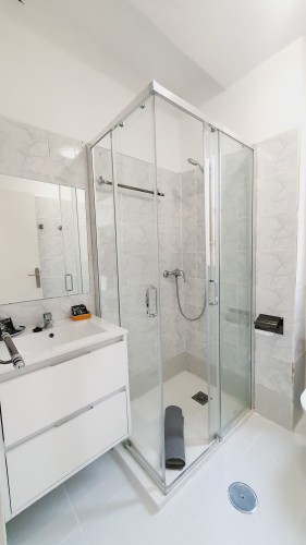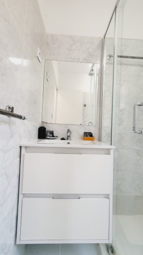 Moderno cuarto de baño con plato de ducha con mampara y lavabo con armario de cajones para tus artículos de belleza.