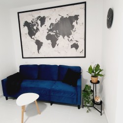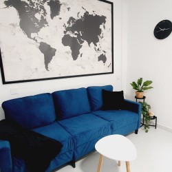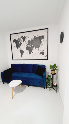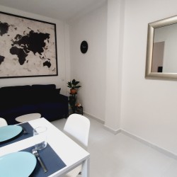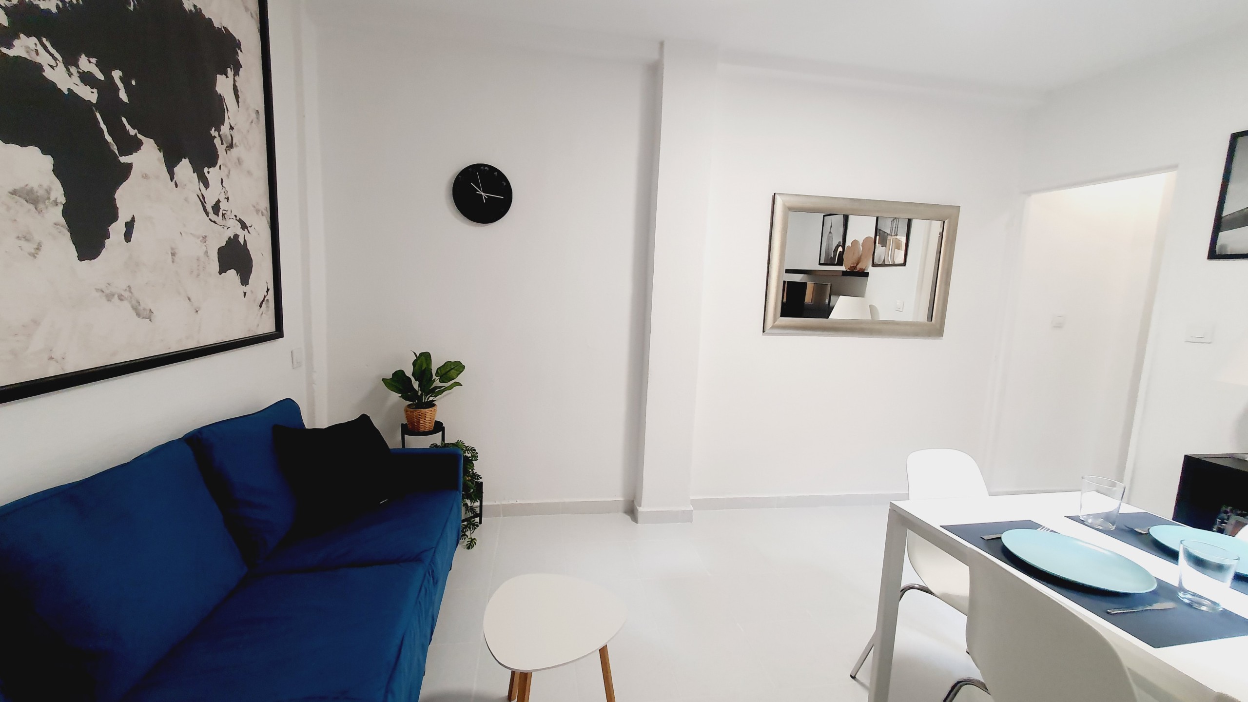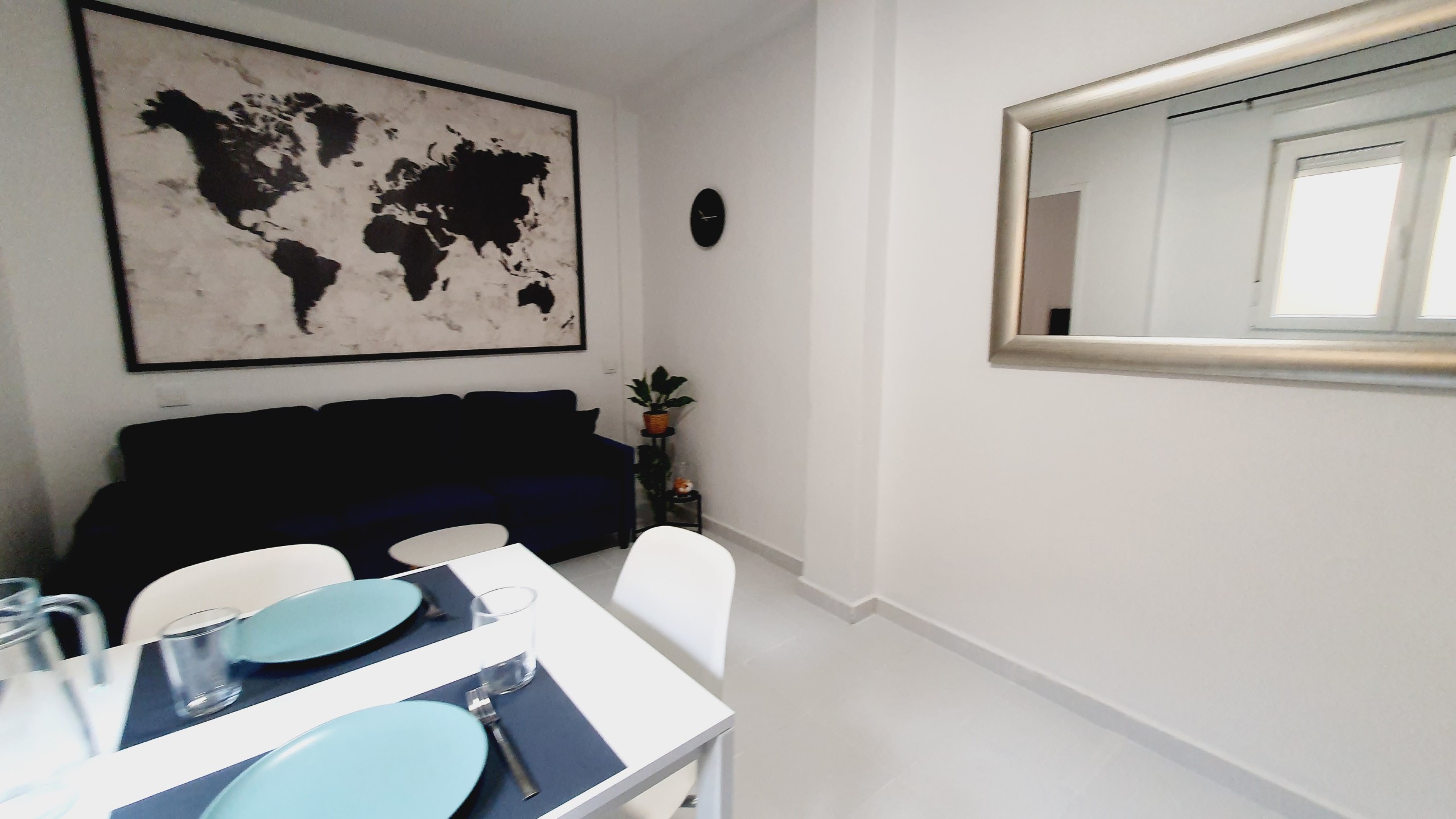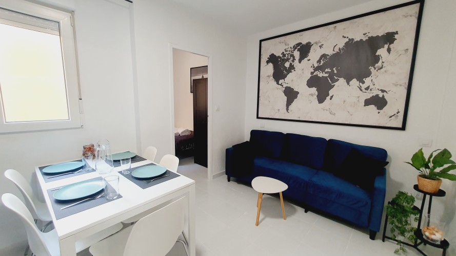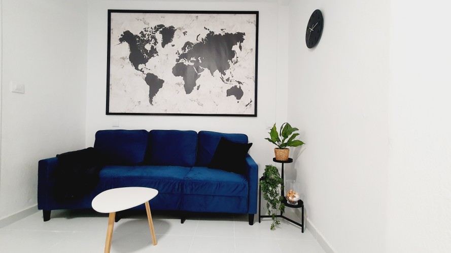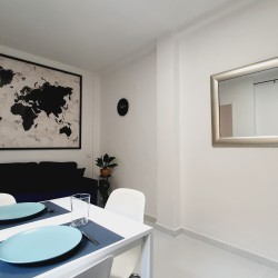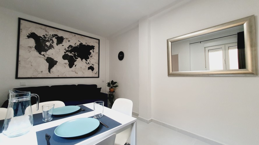 Cómodo y sofisticado. Aquí tienes sofá, Smart TV de 49”, AIRE ACONDICIONADO, y además de una mesa de comedor de hasta 6 personas, y también mesita de centro.