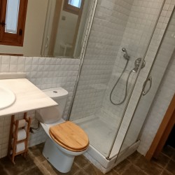 BAÑO con plato de ducha y mampara, ventana al patio interior que permite tener ventilación y gran espejo
