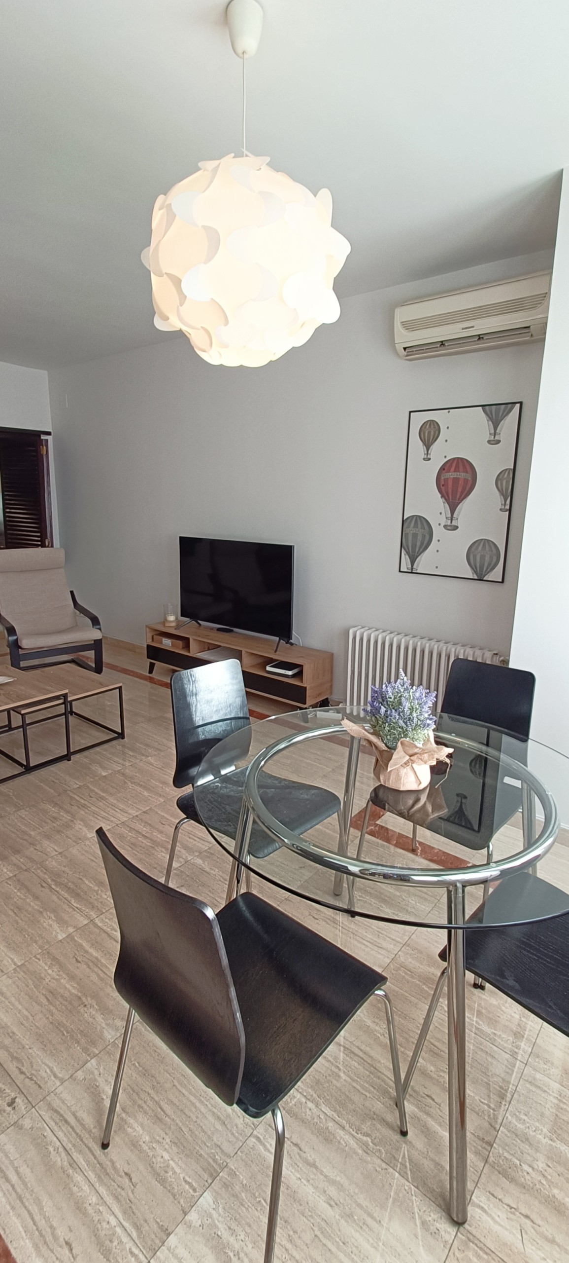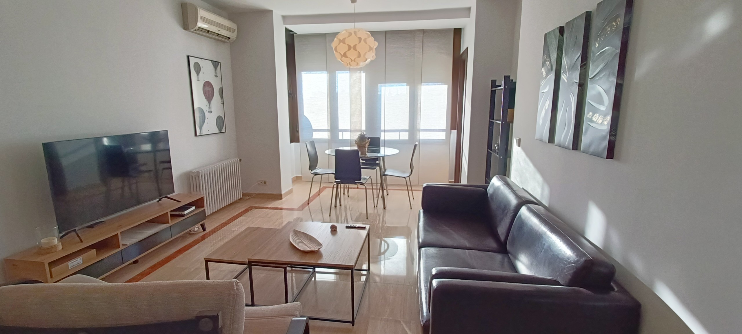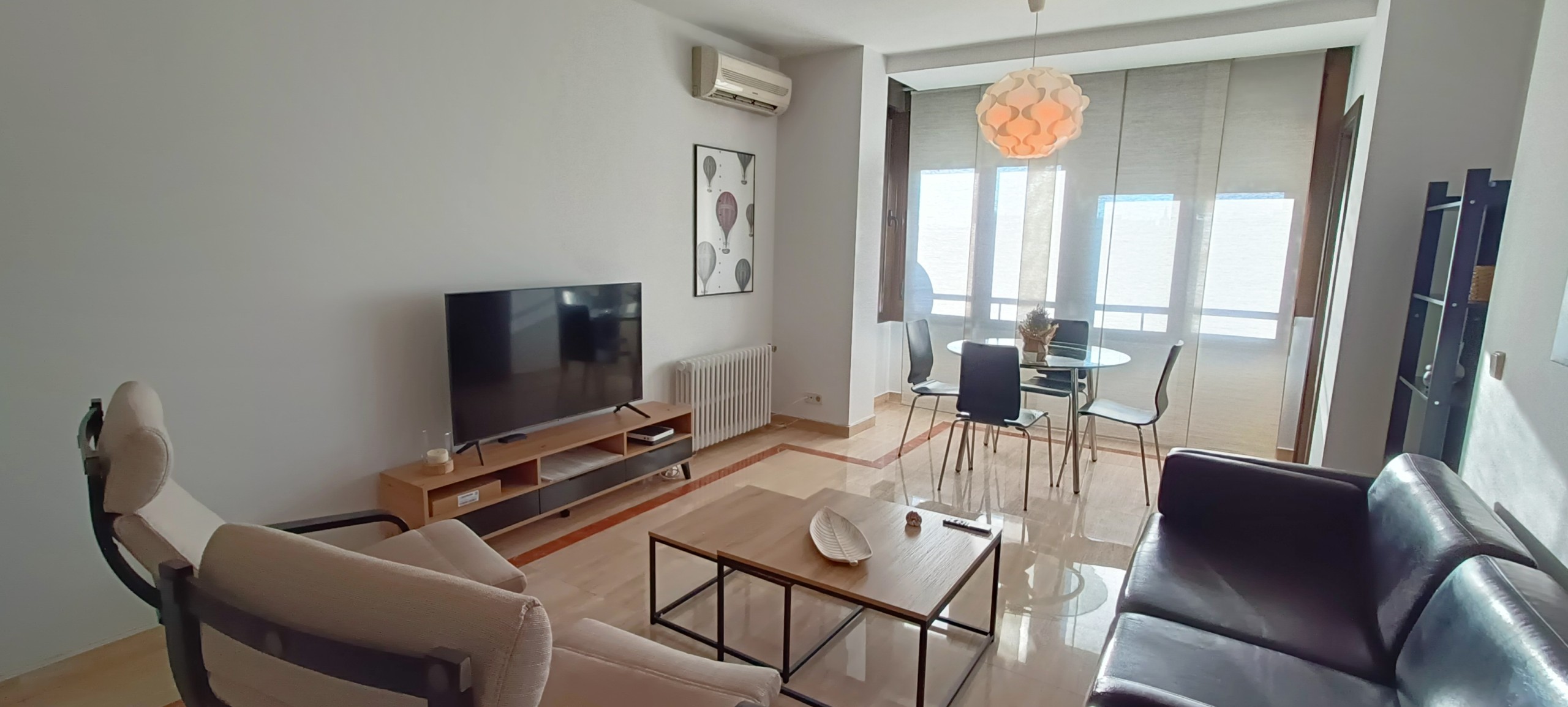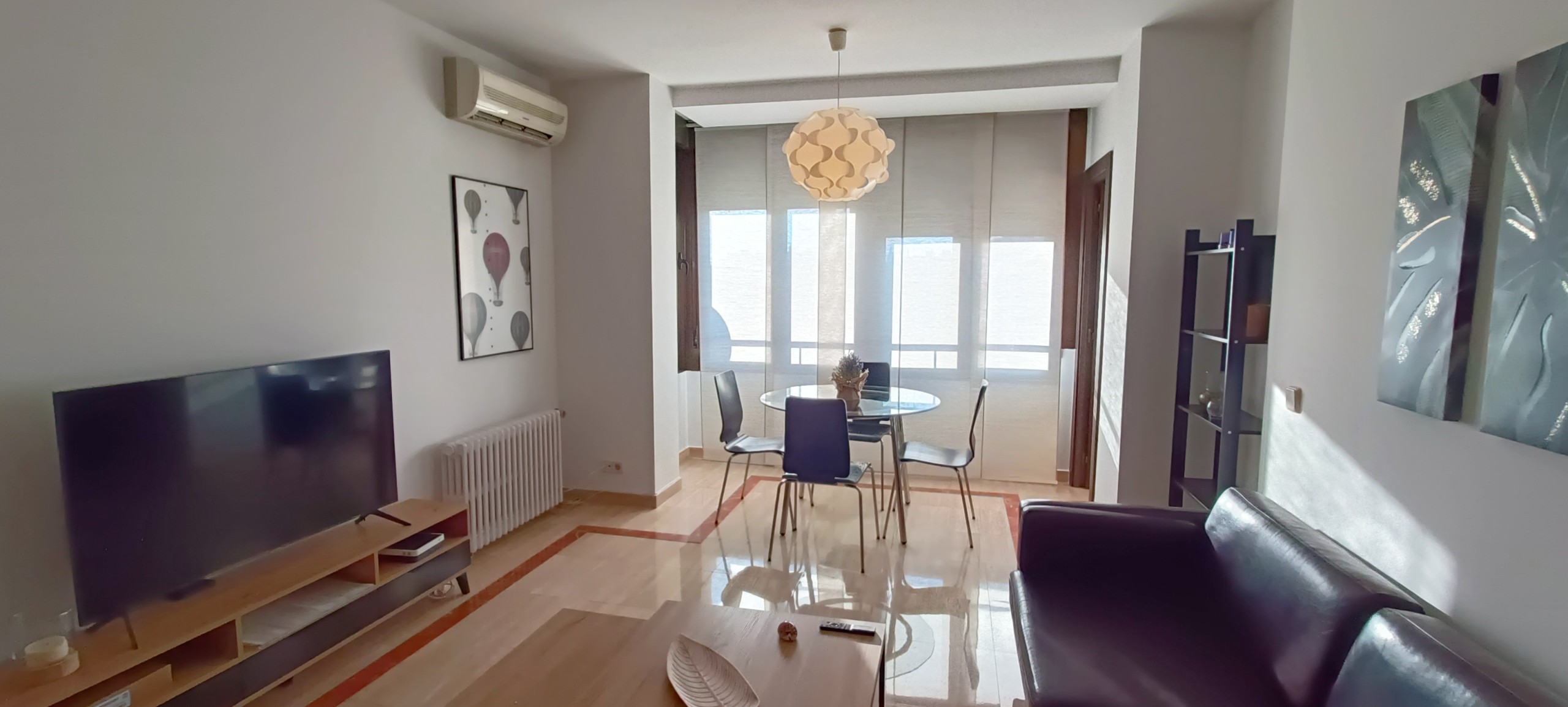 SALÓN-COMEDOR súper LUMINOSO, con vistas a Calle Orense, mesa y sillas, sofá, y tv. Aire acondicionado por split