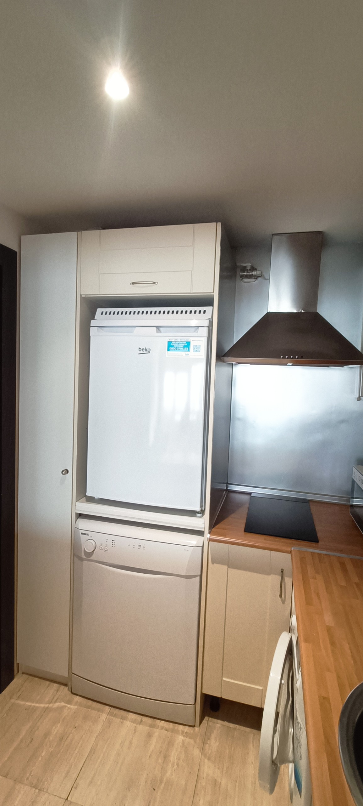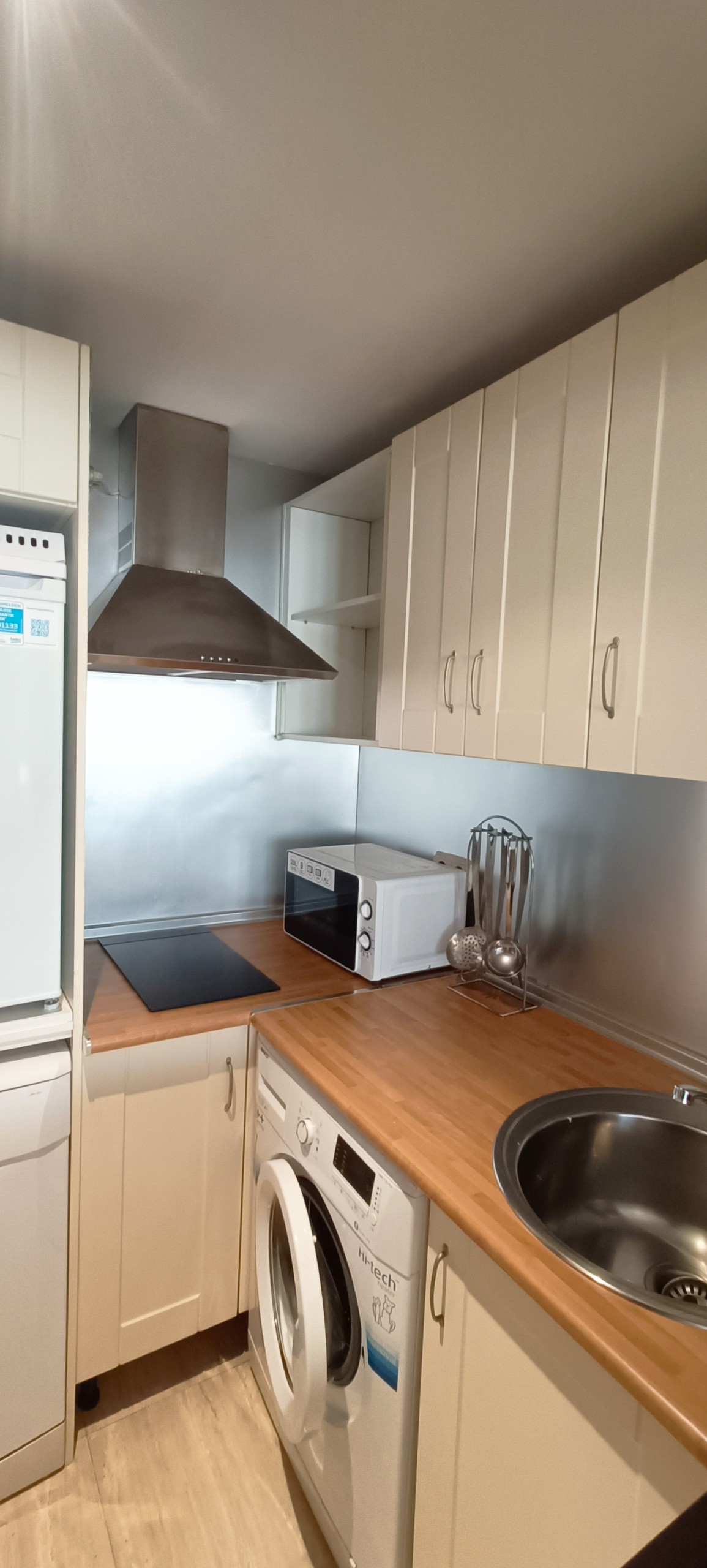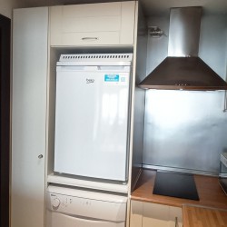 COCINA con barra pasa platos al salón, equipada con placa vitrocerámica, microondas, frigorífico bajo encimera, lavadora y campana extractora