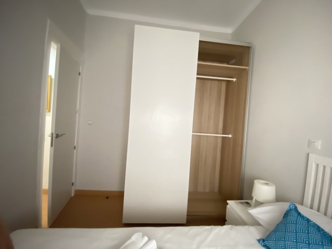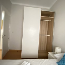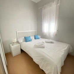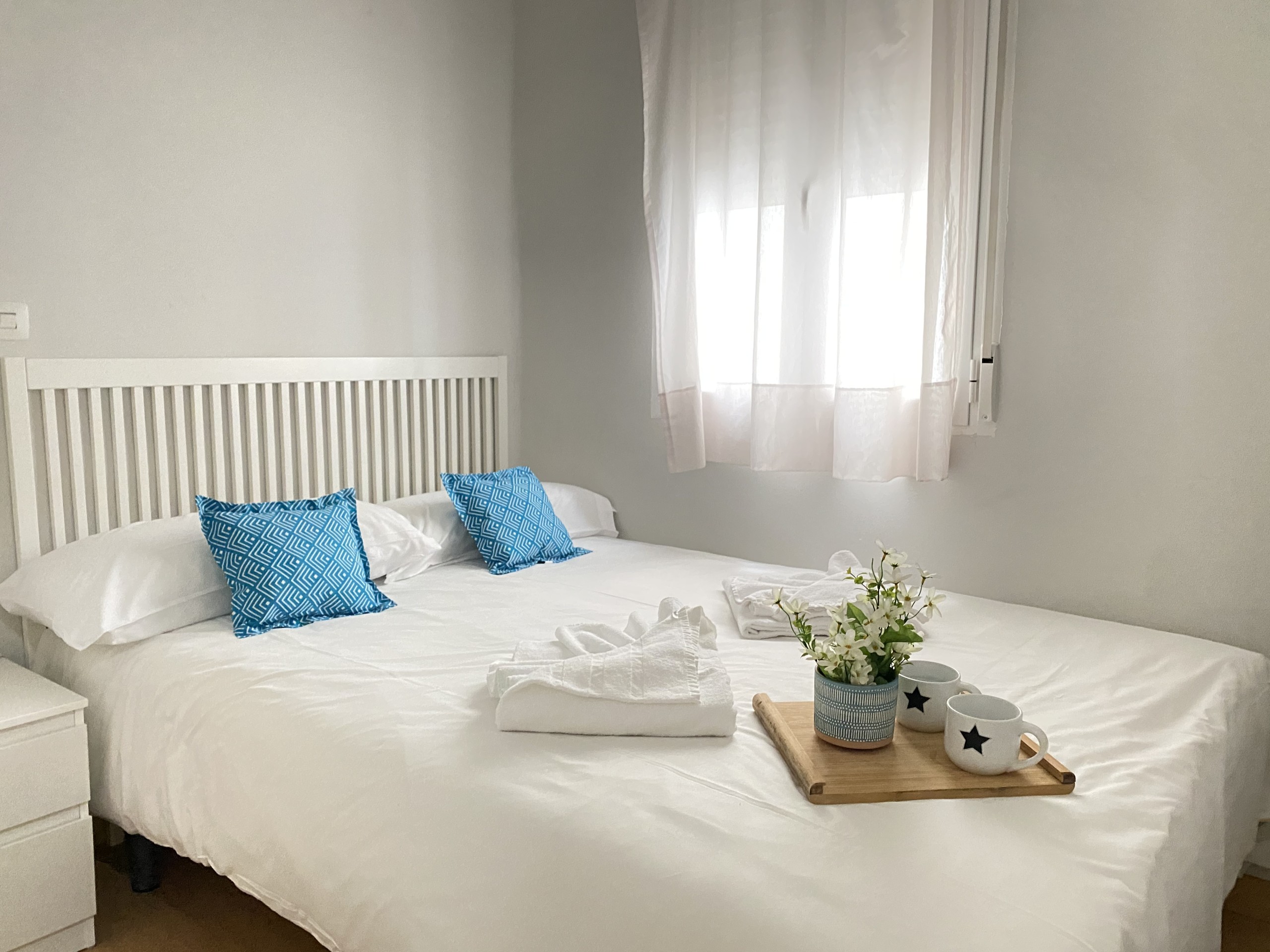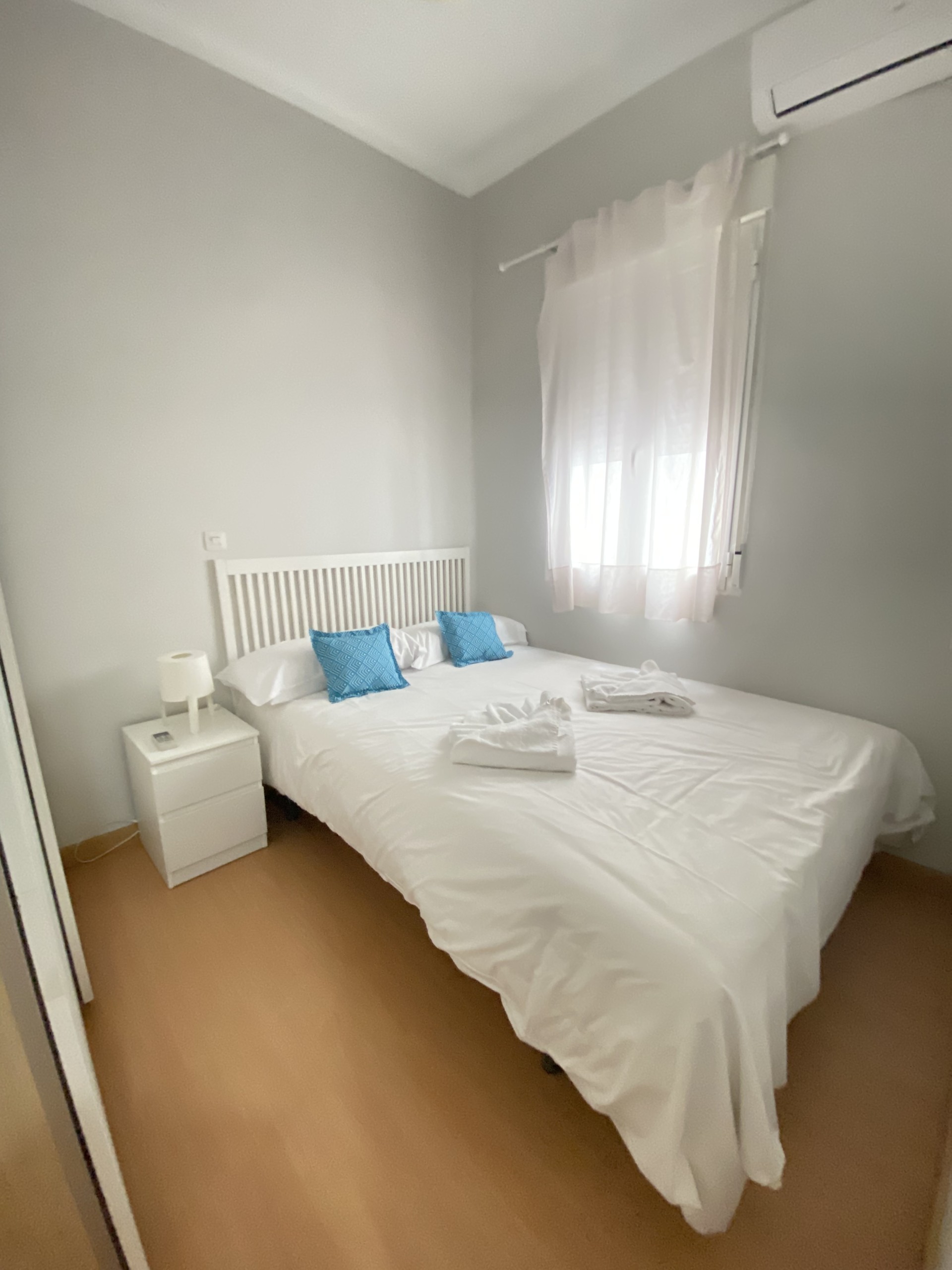 Cómodo dormitorio de cama doble con luz natural, aire acondicionado y un amplio armario.