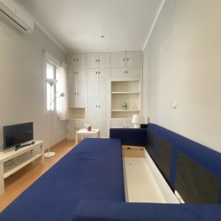 Salón comedor con aire acondicionado, TV, cómodo sofá, mucha luz natural y grande espacio de almacenaje.
