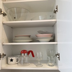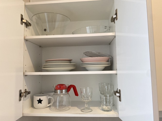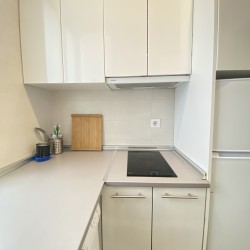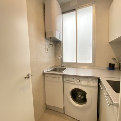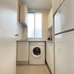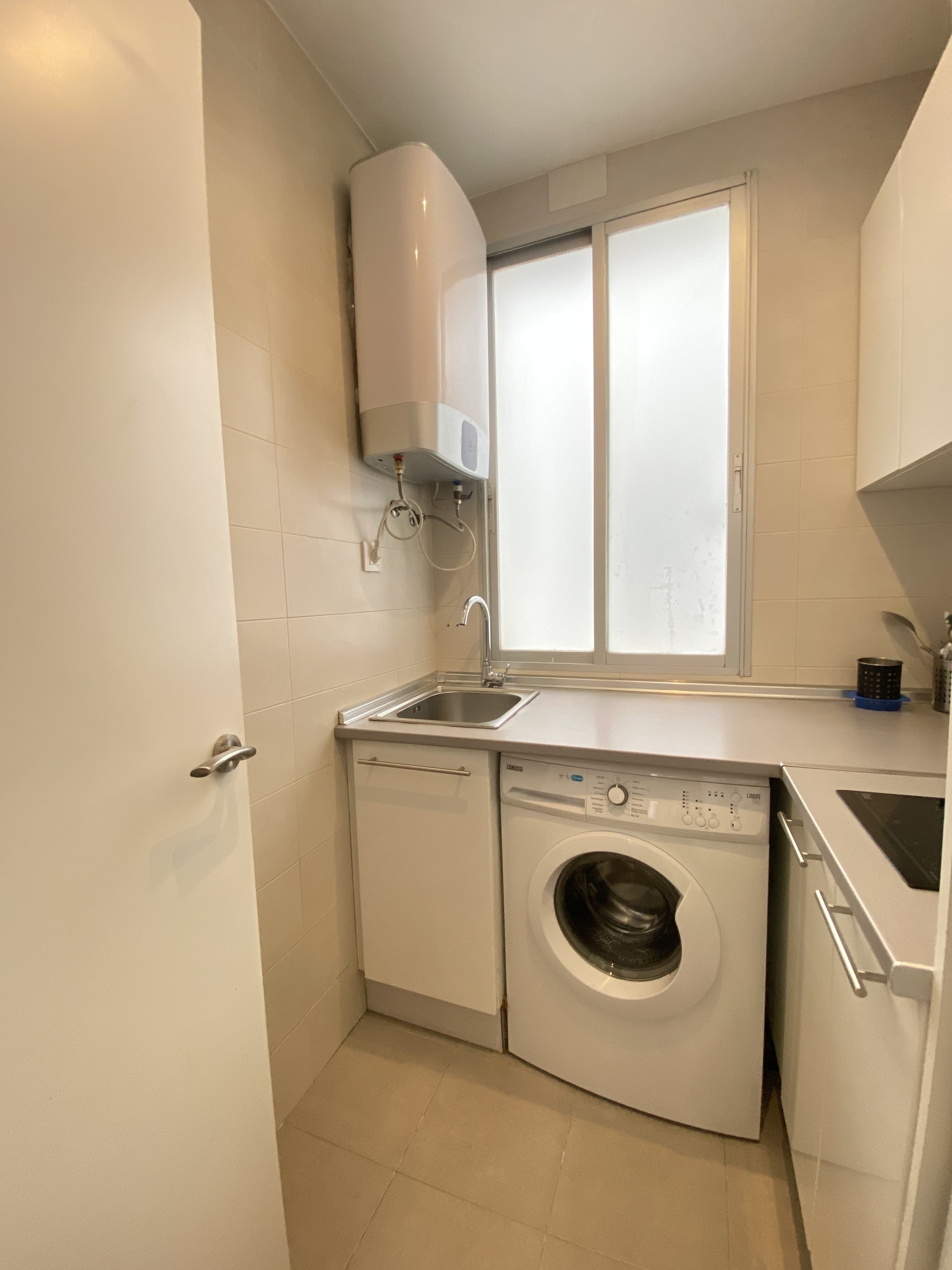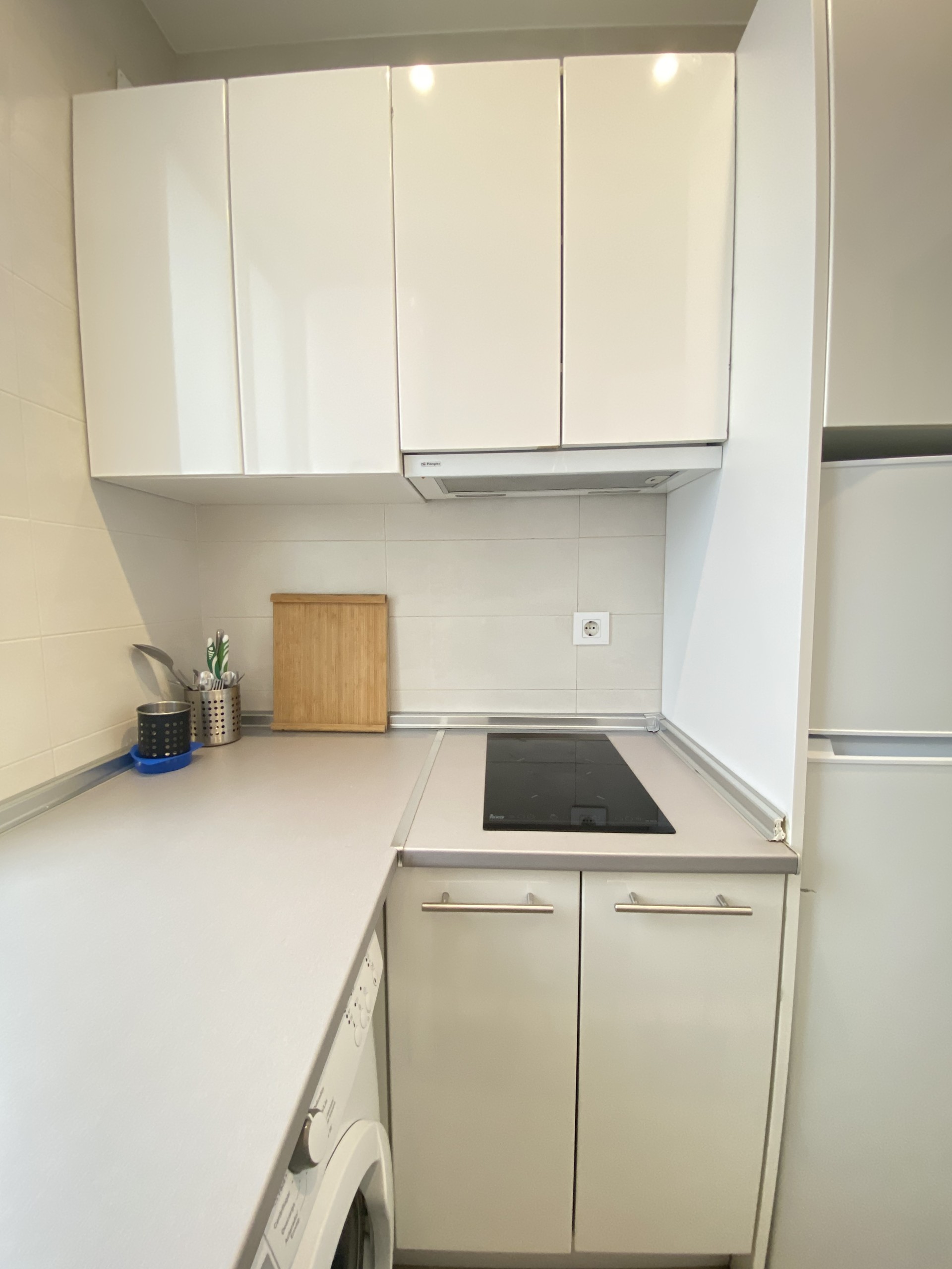 Cocina independiente totalmente equipada con menaje de cocina, campana extractora, nevera, vitrocerámica, lavadora, almacenaje, entre otros.