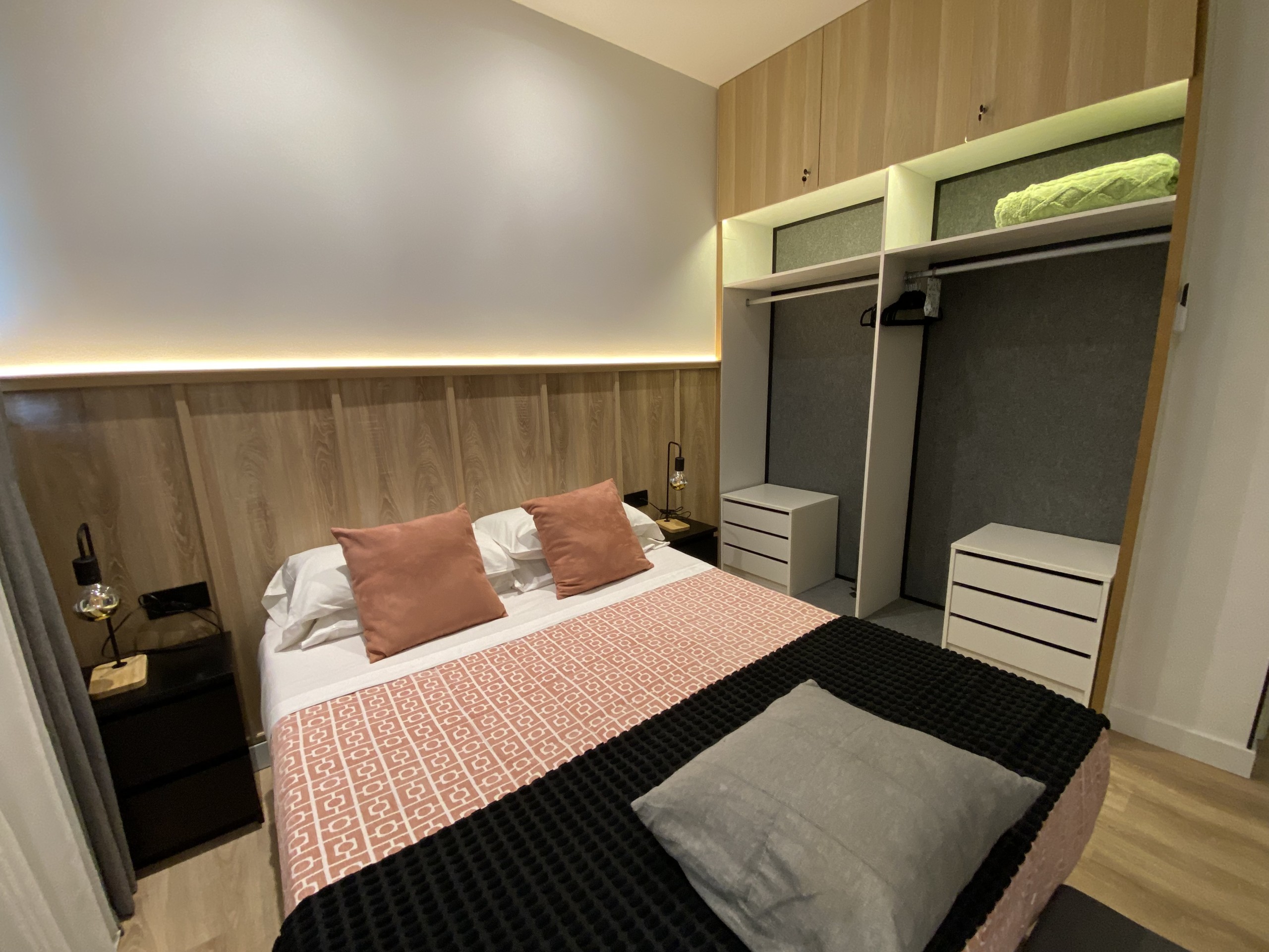 Amplia habitación.Con cama doble, mesitas de noche con lámparas, gran armario empotrado abierto y con TV.