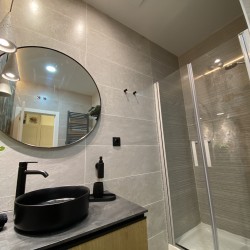 – BAÑO 1: Espléndido baño con decoración en tonos negoros cuenta con plato de ducha individual, toallero radiador y un armario en el lavabo para almacenar enseres personales.
